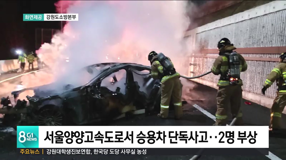 오늘 오전 4시쯤, 홍천군 화촌면 서울양양고속도로 양양 방향 홍천휴게소 인근에서 BMW 차량이 가드레일을 들이 받고 전소됐습니다.