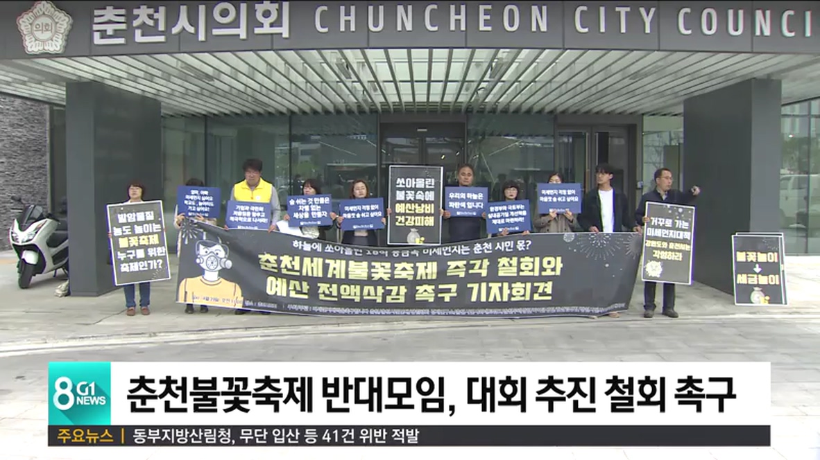 이들 단체는 지난 25일, 도의회 승인도 못 받고 예산 전액을 삭감 당한 14억원 규모의 춘천세계불꽃축제 예산이 기형적으로 춘천시의회 상임위를 통과했다며, 예결위와 본회의에서 관련 예산을 전액 삭감하고 춘천시는 대회 추진을 즉각 철회할 것을 주장했습니다.