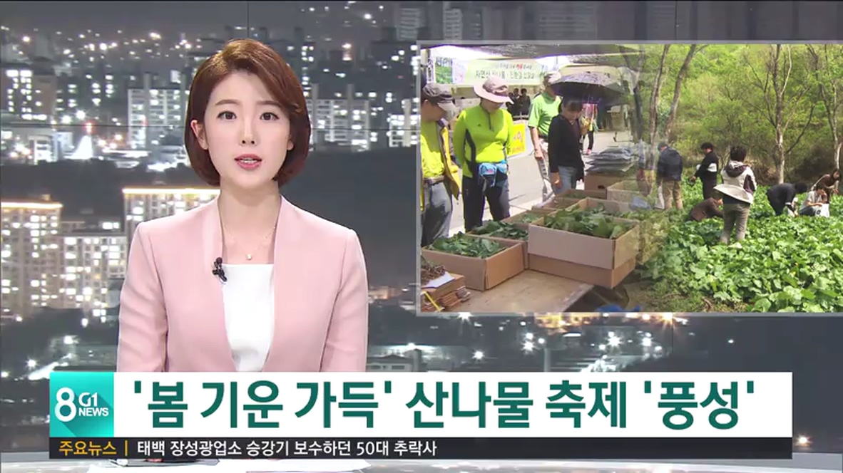 /태백에선 '천상의 산나물 축제'가, 평창과 정선에선 '곤드레 산나물 축제'가 개막했고, '홍천과 인제에서도 지역 특산품과 산나물을 주제로 한 축제가 이어집니다./