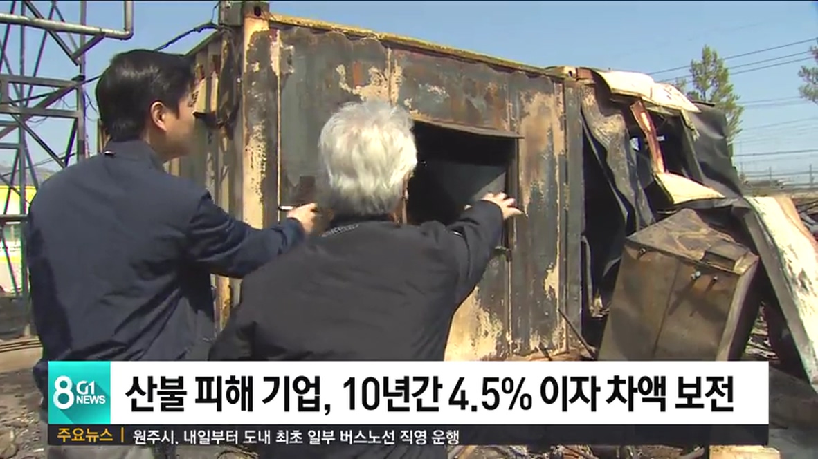 강원도는 산불 피해를 입은 중소기업의 경영 안정을 위해 업체당 5억 원 한도로 최대 10년간, 4.5%에 해당하는 이자를 보전한다고 밝혔습니다.