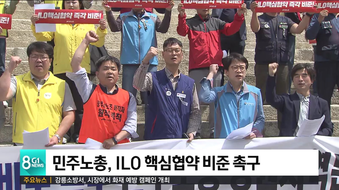 민주노총은 ILO 핵심협약 비준이 문재인 대통령의 핵심 공약 중 하나인데, 정부가 국내법 개정이 선행돼야 ILO 핵심협약을 비준하겠다는 입장을 고수하고 있다며, 조속한 비준을 요구했습니다.