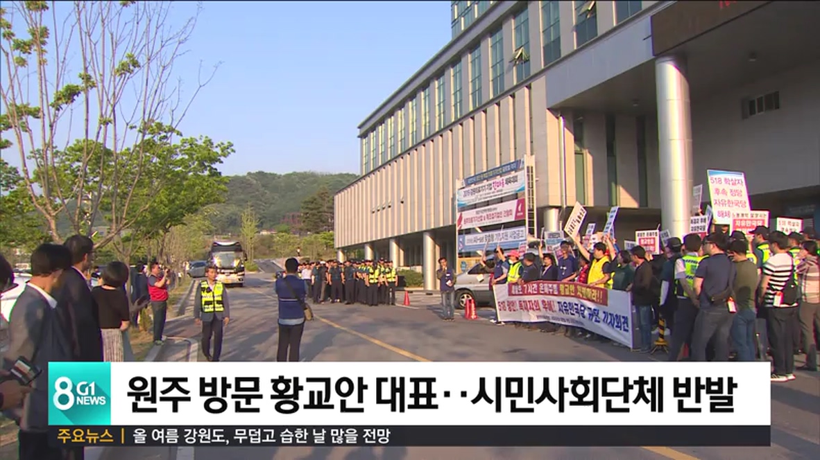 황교안 자유한국당 대표가 고성에 이어 의료기기 업체의 고충을 듣기 위해 원주 기업도시를 방문한 가운데, 강원지역 시민단체가 한국당을 규탄하는 기자회견을 열었습니다.
