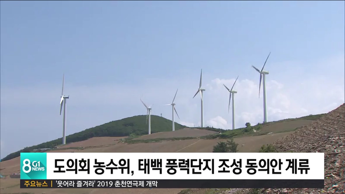 강원도의회 농림수산위원회는 태백시 창죽동 도유림 8천 2백㎡부지에 145억 원 규모의 3.83MW급 풍력 발전기 1기를 건설하는 내용의 '공유재산 영구시설물 축조를 위한 동의안'을 계류했다고 밝혔습니다.