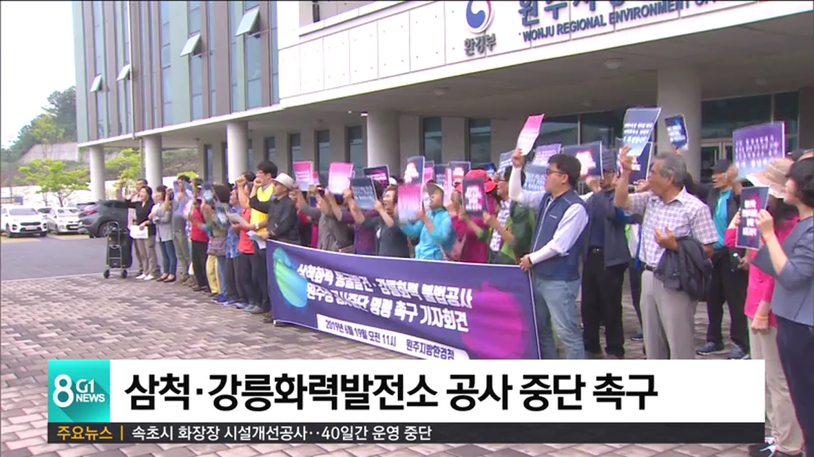 삼척과 강릉화력발전을 반대하는 지역주민들과 환경단체, 정당이 원주지방환경청 앞에서 공사 중단을 촉구하는 기자회견을 개최했습니다.