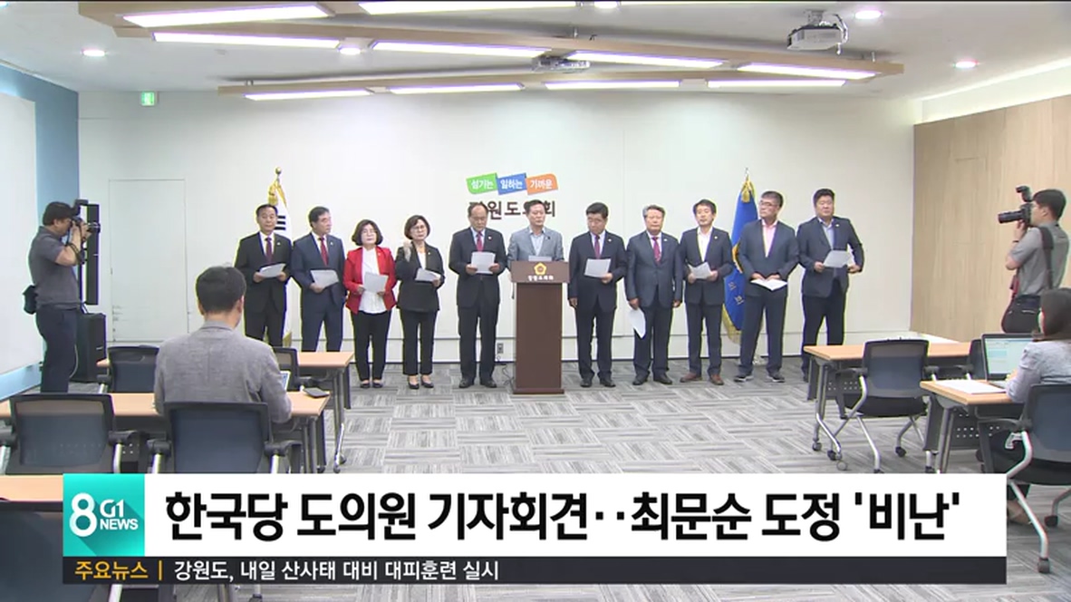자유한국당 도의원 11명은 도의회 세미나실에서 기자회견을 열고, 최문순 도지사의 도정이 즉흥적이고 일방통행식이라 도민들의 삶의 질을 하락시키고 있다고 비난했습니다.