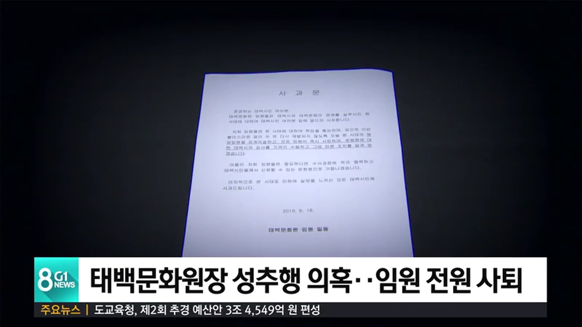 태백문화원 임원 일동은 사과문을 통해 "앞으로 불미스러운 일이 두 번 다시 재발하지 않도록 해당 임원을 징계 의결하고, 모든 임원이 즉시 사퇴하겠다"고 밝혔습니다.