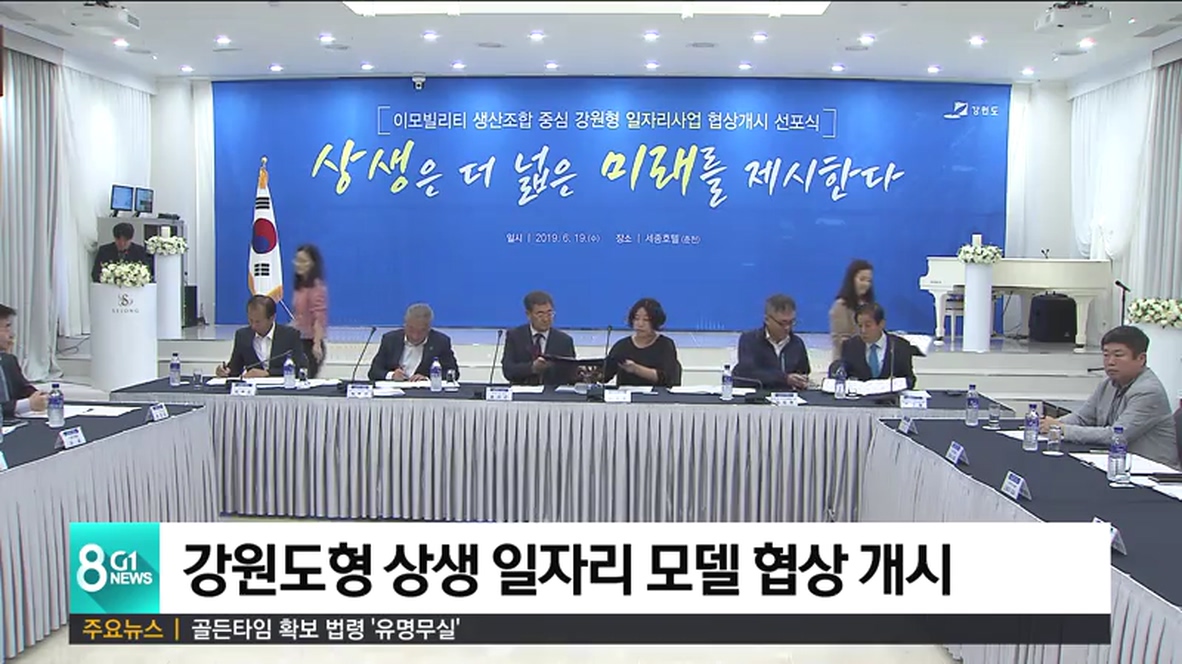 강원도는 오늘(19일) 춘천 세종호텔에서 횡성 이모빌리티 사업에 참여 의사를 밝힌 15개 기업 노사 대표들이 참석한 가운데, 상생협약을 위한 협상 개시 선포식을 가졌습니다.