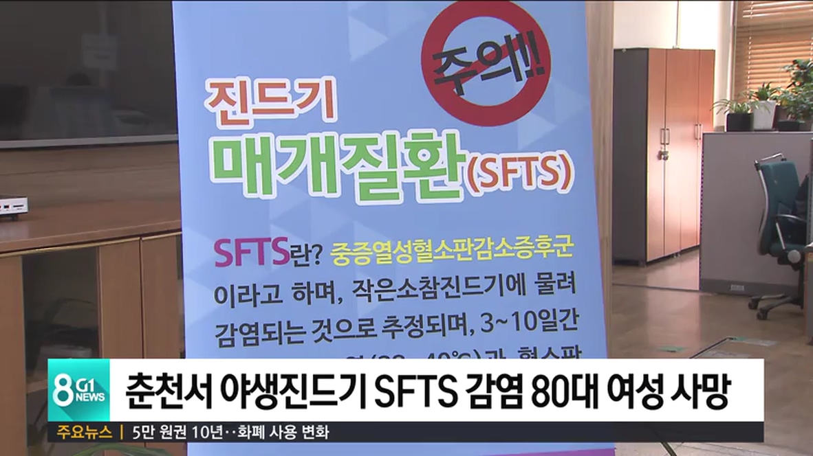 춘천시 보건소는 지난 17일 야생진드기에 의해 감염되는 중증 열성 혈소판 증후군인 'SFTS' 확진 환자로 확인돼, 강원대 병원에서 치료를 받던 80대 A씨가 어제 숨졌다고 밝혔습니다.