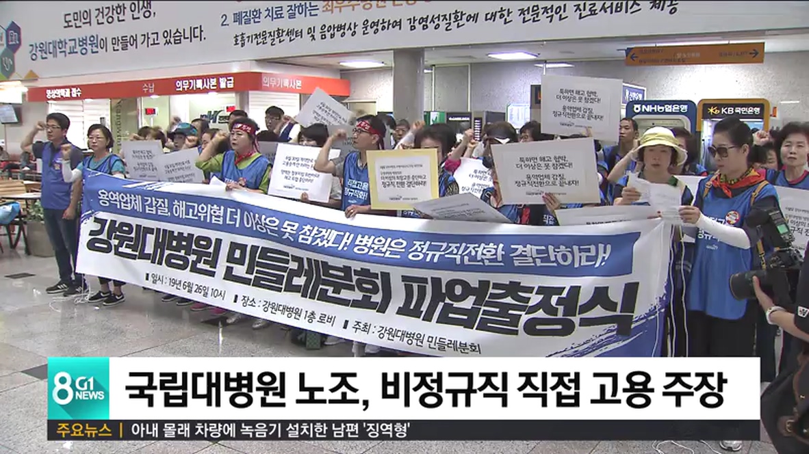 민주노총 의료연대본부 강원대학교병원 민들레분회는 오늘(26일) 강원대학교병원 본관 1층 로비에서 파업출정식을 갖고, 비정규직 노동자들의 정규직 전환을 요구했습니다.