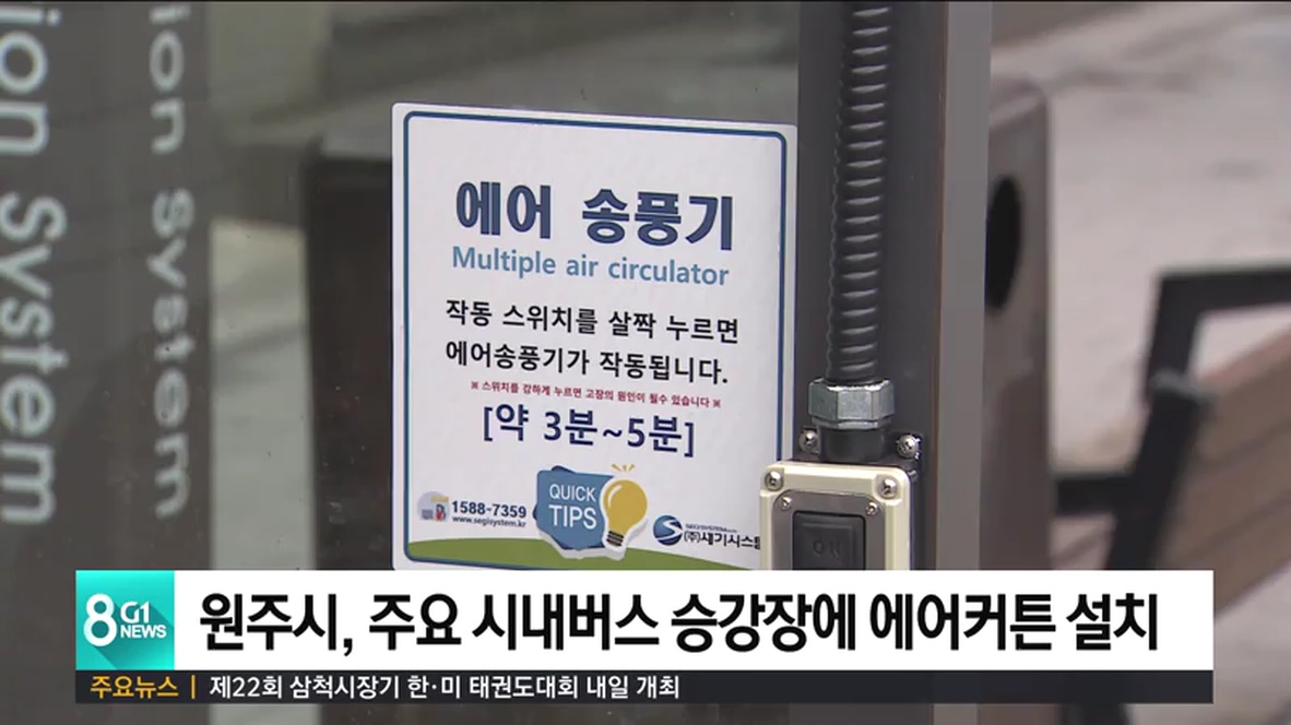 원주시는 시민들의 여름철 폭염 피해 예방과 쾌적한 대중교통 환경 조성을 위해 시내 주요 버스 승강장에 에어커튼을 설치했습니다.