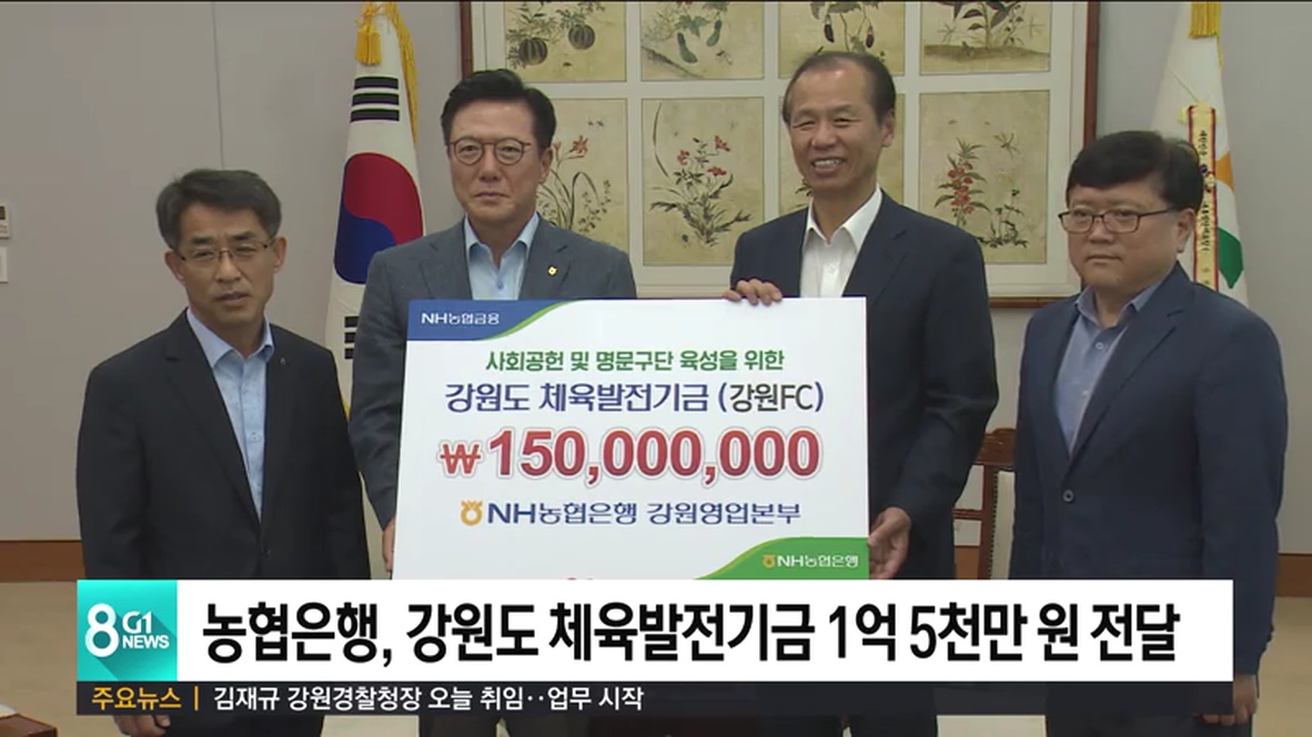 NH 농협은행 강원본부는 오늘(4일) 강원도청에서 강원도 체육발전을 위해 사용해 달라며 강원도에 1억 5천만 원을 전달했습니다.