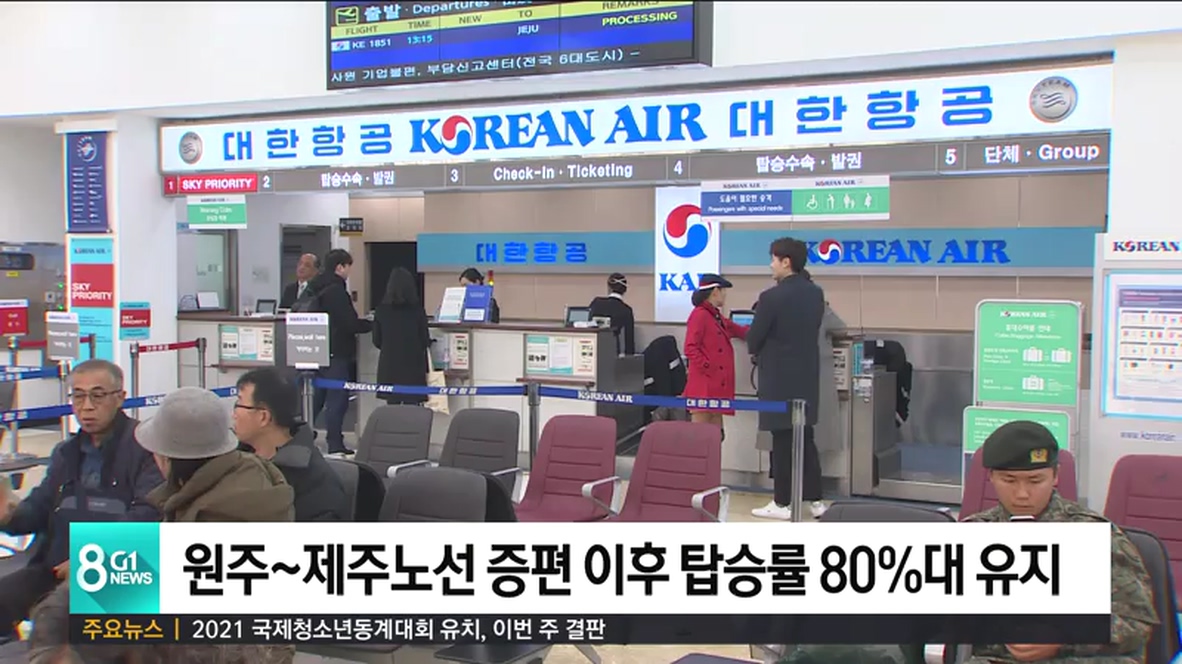 강원도는 올해 3월, 원주~제주노선의 운항 횟수를 1일 1회에서 2회로 늘린 이후, 백일 동안 3만 2천여 명이 이용하는 등 꾸준히 탑승률을 80% 이상 유지하고 있다고 밝혔습니다.