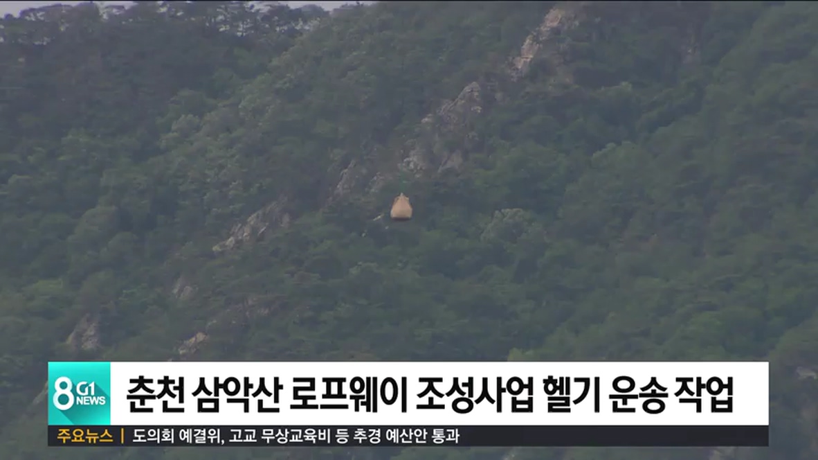 춘천시에 따르면, 오늘 로프웨이 상부정차장이 조성될 해발 450m 높이의 삼악산 중턱에 정차장 공사를 위한 자재를 헬기로 운송하는 작업을 했습니다.