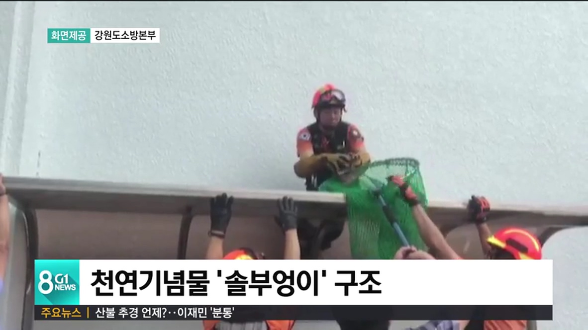 오늘(25일) 오전 10시쯤 강원도청 별관 쪽 비 가림막과 벽 사이에 껴 있던 천연기념물 제324호 솔부엉이가 구조됐습니다.