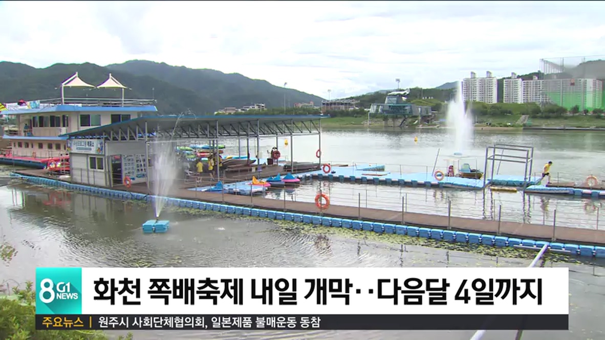 화천군은 내일 오후 붕어섬 야외무대에서 열리는 화천 뮤직페스티벌을 시작으로, 다음달 4일까지 화천천과 붕어섬 일대에서 '2019 물의 나라 화천 쪽배축제가 개최된다고 밝혔습니다.