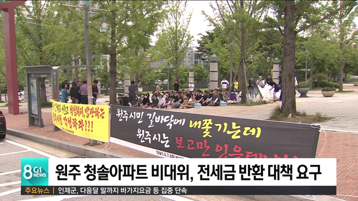 청솔아파트 비상대위원회는 오늘(31일) 원주시청 앞에서 집회를 열고, "임대 사업자가 지난해 말부터 전세 계약이 끝난 100여 세대의 전세금을 돌려주지 않고 있다"며, "규모만 90억원에 달하는 것으로 추정된다"고 주장했습니다.