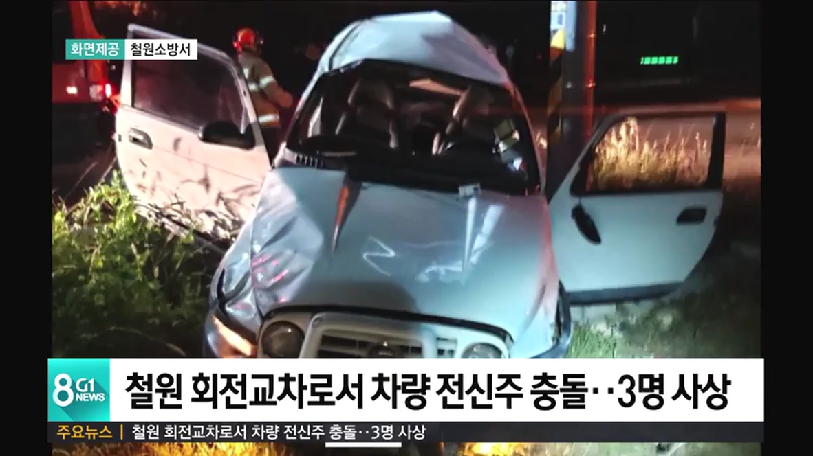 철원 회전교차로서 차량 전신주 충돌..3명 사상