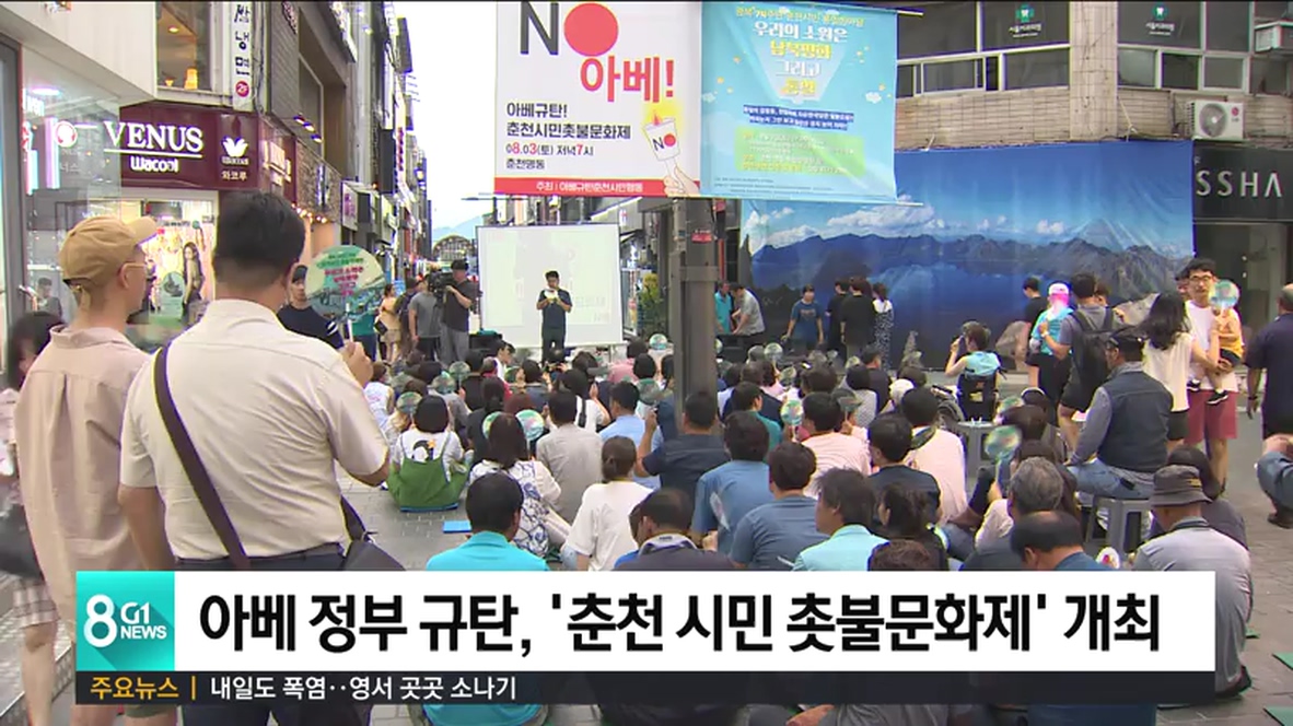 일본 아베 정부의 화이트리스트 배제 조치를 규탄하는 시민촛불문화제가 오늘 춘천시 명동 일대에서 열렸습니다.
