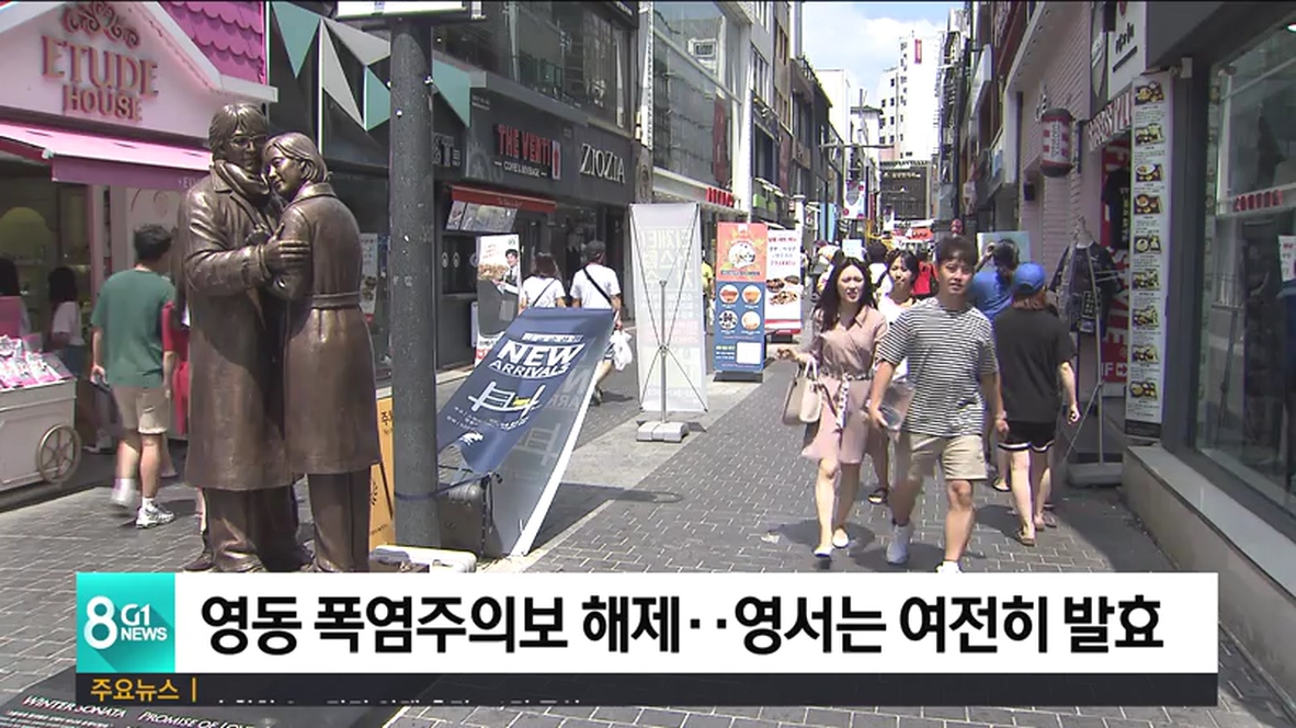 영동지역에 내려졌던 폭염주의보가 오후 6시를 기해 해제됐지만, 강원 영서 대부분 지역에는 여전히 폭염특보가 발효 중입니다.