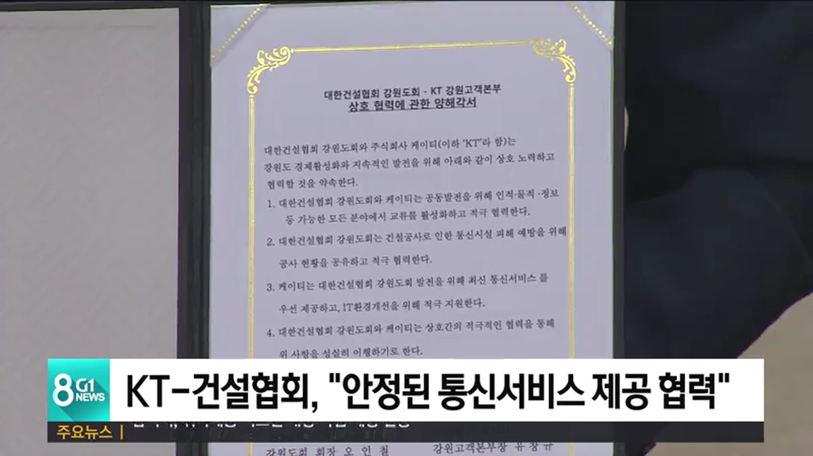 KT 강원고객본부와 대한건설협회 강원도회는 오늘 건설협회 도회에서 안정된 통신서비스 제공을 위한 업무협약을 체결했습니다.
