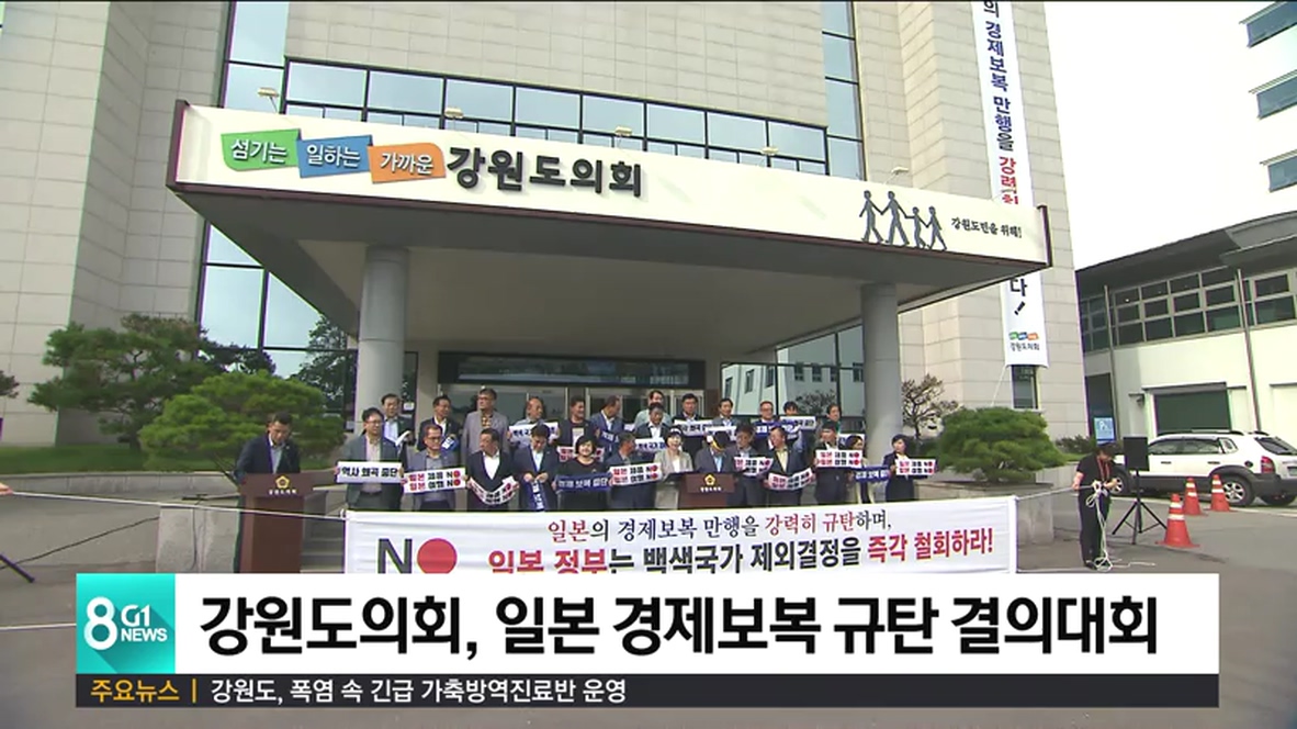 강원도의회는 오늘(6일) 의회 앞에서 도의원들이 참석한 가운데 한국을 수출우대국가 '화이트리스트'에서 제외한 일본의 결정을 즉각 철회할 것을 촉구하는 결의대회를 개최했습니다.