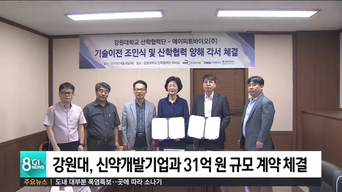 강원대학교와 국내 신약개발기업인 에이피트바이오는 오늘(8일) 강원대 산학협력단에서 항암, 항체 신약 후보물질 기술이전에 대한 조인식을 가졌습니다.