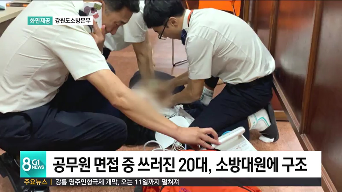 다행히 면접 장소가 도 소방본부가 배치된 건물이어서, 상황을 접수한 소방대원들이 곧바로 심폐소생술을 실시한 뒤 병원으로 옮겼습니다.