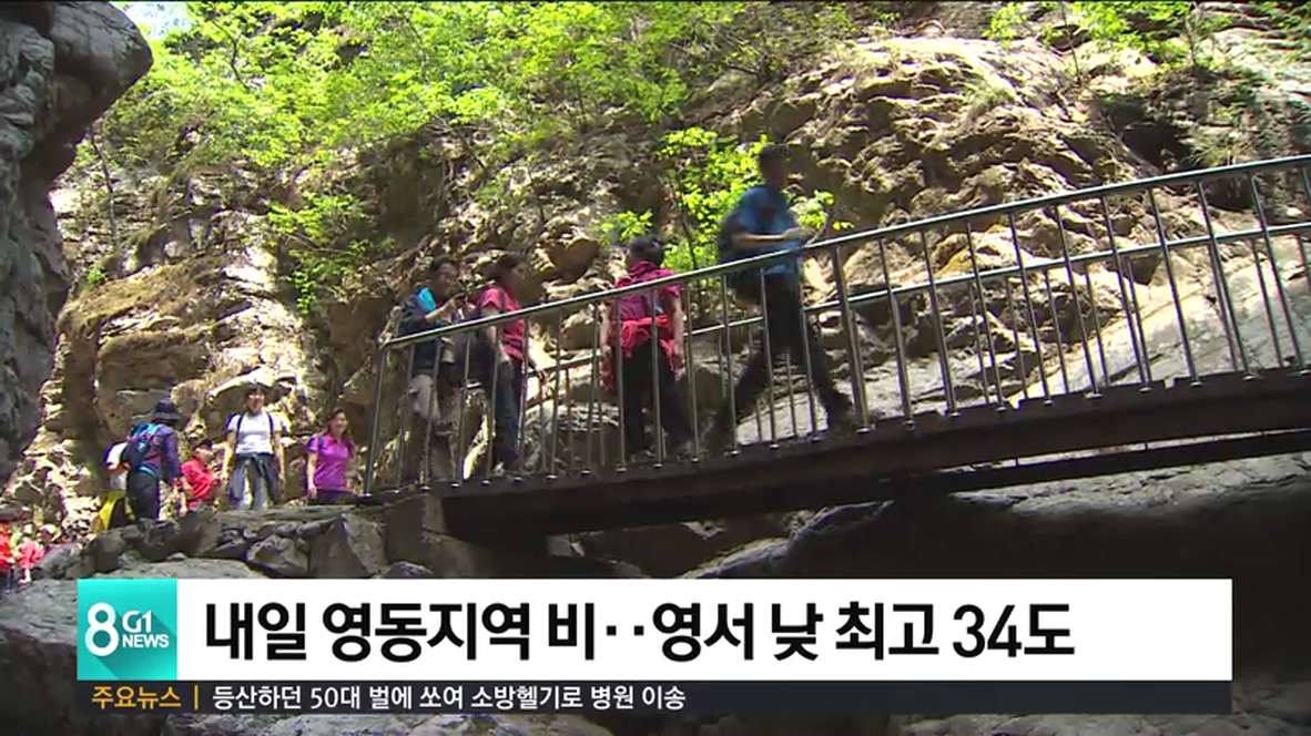 아침 최저 기온은 20도에서 25도의 분포를 보이겠고, 낮 최고 기온은 영서가 31도에서 34도, 영동은 27도에서 29도로 오늘과 비슷하겠습니다.