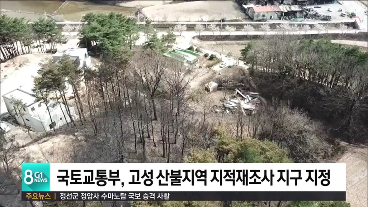 국토교통부는 산불 발생으로 주택 피해가 심각한 고성군 토성면 성천리와 용촌리, 원암리 등 5개 지역에 대해, 이번달 중 긴급 지적재조사 사업 지구로 지정을 추진한다고 밝혔습니다.