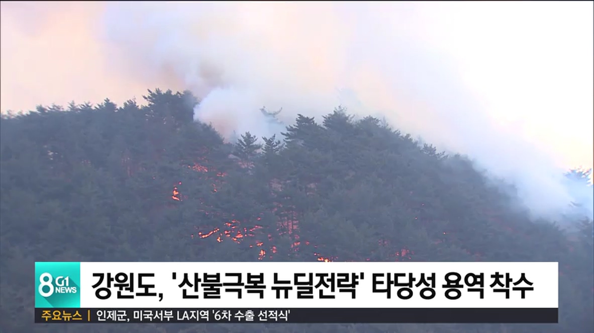 강원도는 지난 4월 발생한 대형 산불을 계기로 새로운 개념의 산불 방지 대책과 복구 방법 모색을 위한 산불극복 뉴딜전략 타당성 검토 용역에 착수했다고 밝혔습니다.