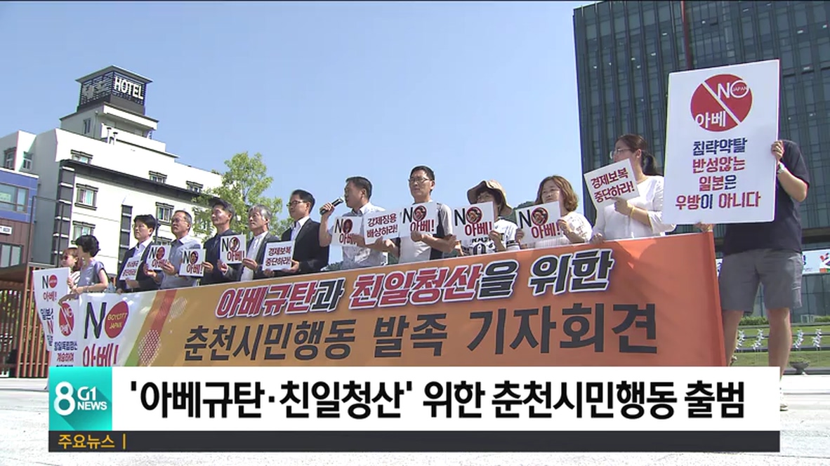 춘천시민행동은 앞으로, 사죄는 커녕 역사 왜곡과 경제 보복 조치를 감행하는 아베 정부를 강력 규탄하고 이같은 움직임에 동조하는 친일 세력을 청산하는데 힘을 모으겠다고 밝혔습니다.