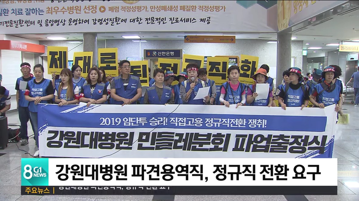 민주노총 의료연대본부 강원대학교병원 민들레분회는 오늘(22일) 오전 강원대병원 로비에서 파업 출정식을 열고, '직접 고용, 정규직 전환'을 요구했습니다.