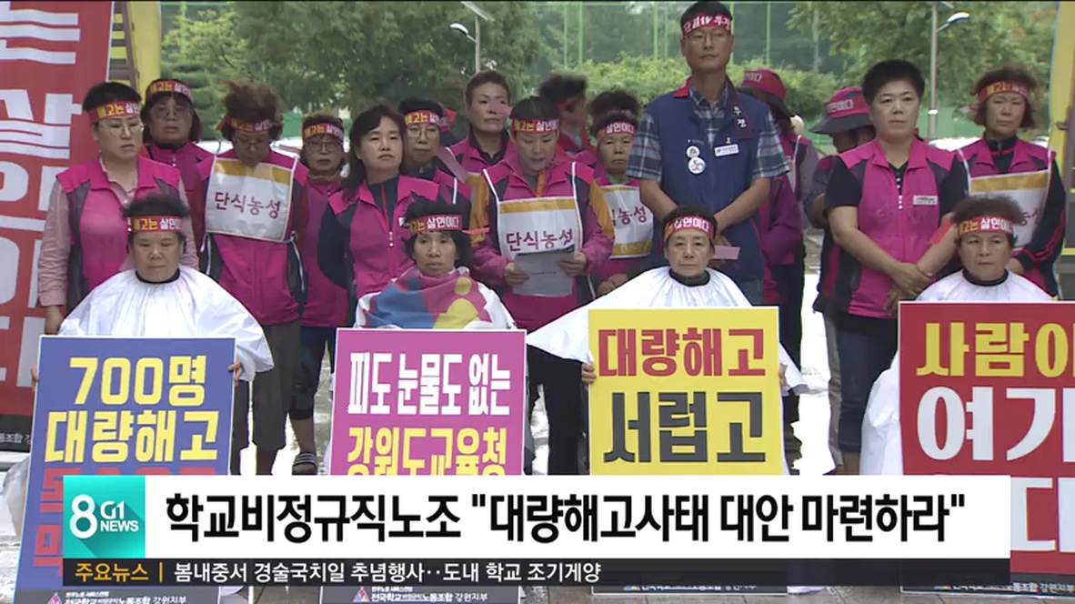 이들은 "사전심사제를 통한 청소원 등 학교 비정규직 근로자 대량해고 사태에 대해 도교육청이 대안을 마련해야 한다"며 내부적으로 논의를 해 줄 것을 요구했습니다.