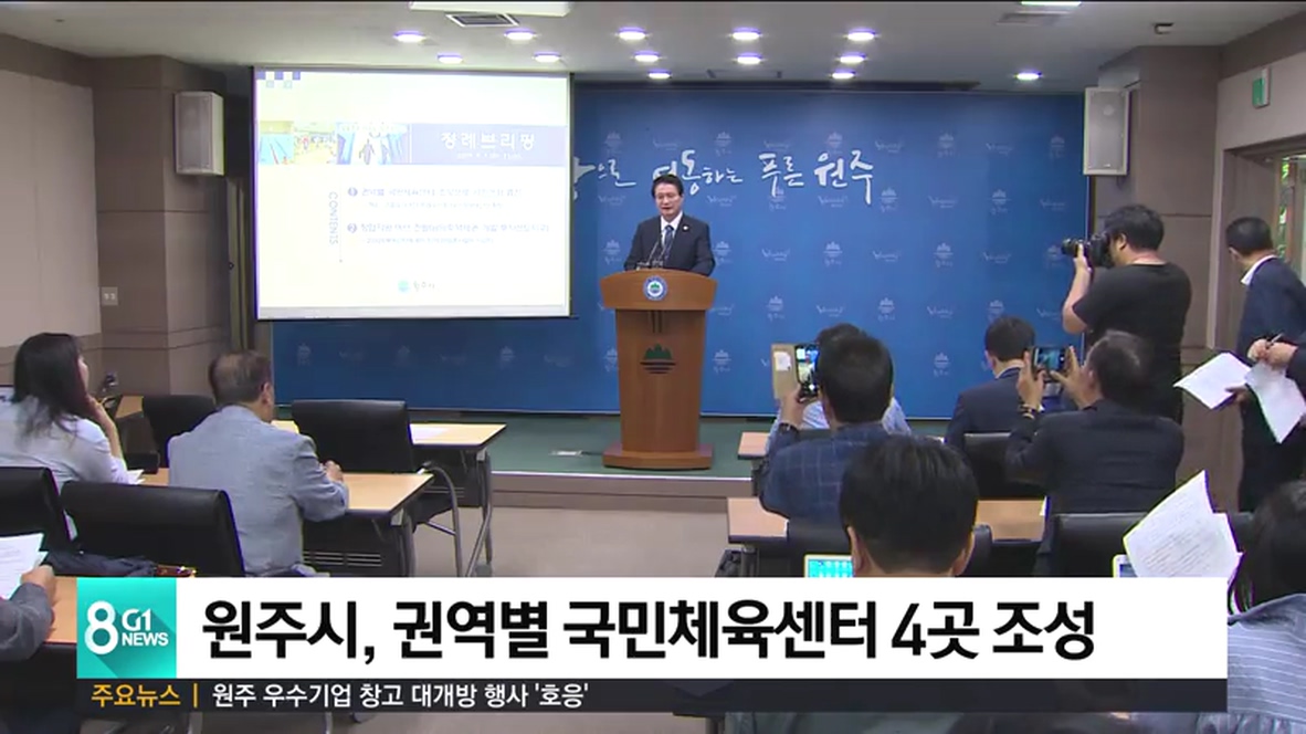 원창묵 원주시장은 정례브리핑에서 혁신도시와 기업도시, 무실동 남권역, 태장동 캠프롱 부지 등 4곳에 국민체육센터를 건립할 계획이라고 밝혔습니다.