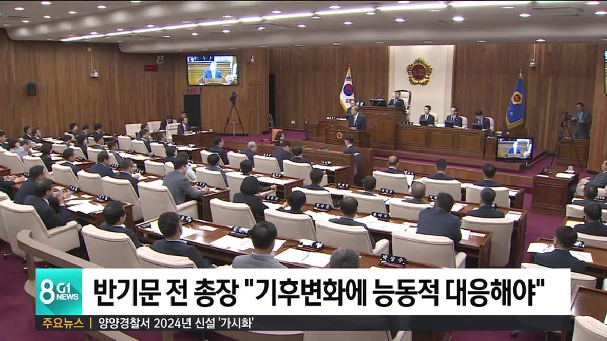 강원도의회 개원 63주년 기념 초청연설자로 나선 반 전 총장은 "이미 전 세계적으로 기후변화 현상이 가속화되고 있고, 강원도에서도 해변 침식이 증가하고 수온 변화로 어종이 변하고 있다"며, "기후변화에 선제적이고 적극적으로 접근해야 한다"고 강조했습니다.