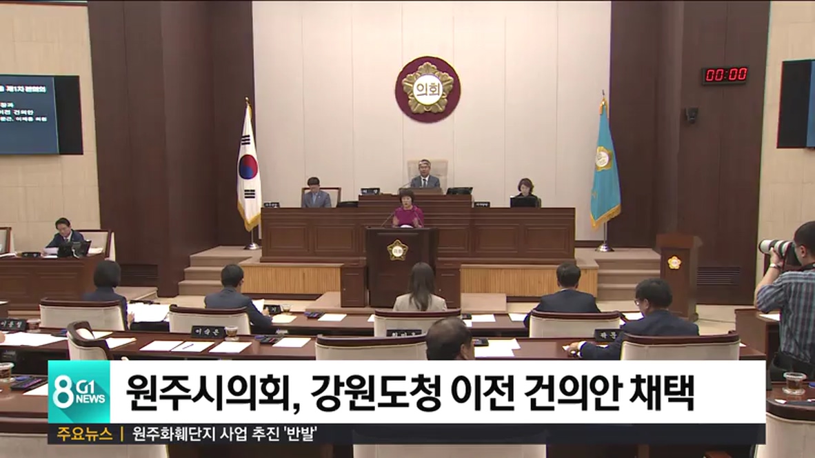 원주시의회는 오늘 열린 제212회 임시회에서 김정희 의원이 대표 발의한 '강원도의 지속 가능한 성장과 균형 발전을 위한 도청 이전 건의안'을 채택했습니다.