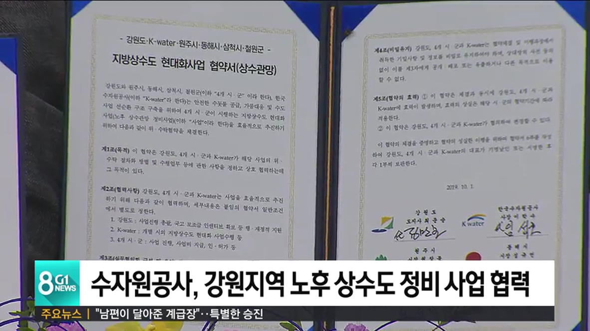 한국수자원공사와 강원도, 4개 시군이 업무 협약을 맺고 노후 수도관 정비 사업에 함께 노력하기로 했습니다.