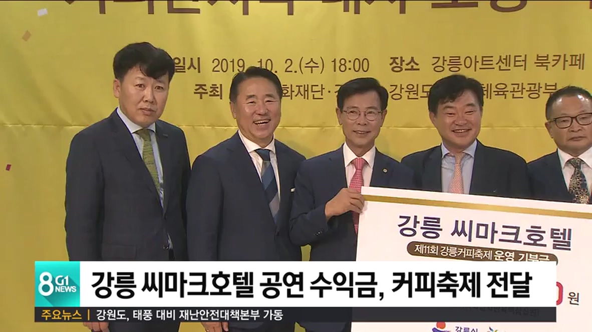 지난 8월 G1 강원민방과 강릉아트센터 등의 후원으로 일주일 간 씨마크 페스티벌을 개최한 강릉 씨마크호텔이 공연 수익금을 '제11회 강릉커피축제' 운영 기금으로 전달했습니다.