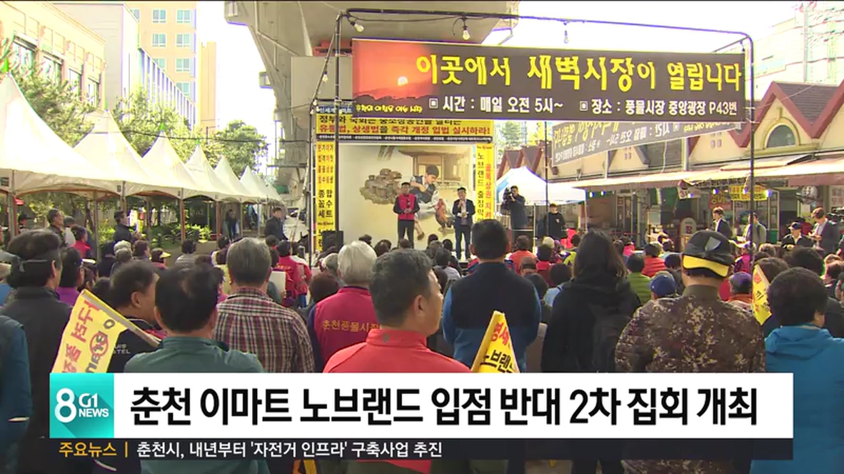 춘천의 상인회와 시민단체 18곳이 오늘(8일), 춘천시 풍물시장에서 기업형 수퍼마켓인 이마트 노브랜드 입점을 반대하는 2차 궐기대회를 열었습니다.