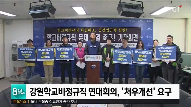 강원학교비정규직 연대회의는 오늘(10일) 강원도교육청 브리핑룸에서 기자회견을 열고, 처우개선과 공정 임금제의 실현을 요구했습니다.