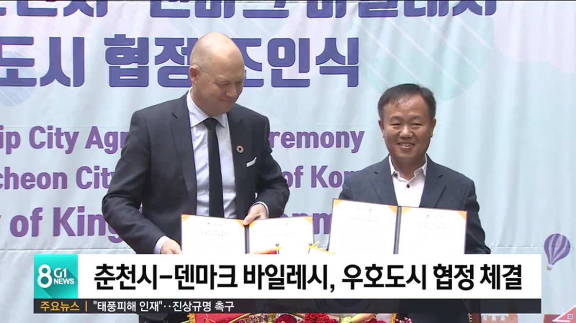 춘천시는 오늘 춘천시청 중앙정원에서 덴마크 바일레시 한스 아이너 크리스텐스 시장이 참석한 가운데, 우호도시 협정을 체결하고 두 지역 간 교류 협력을 확대한다고 밝혔습니다.