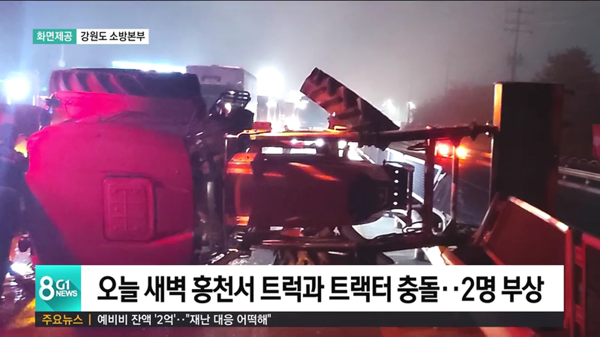 오늘 새벽, 홍천서 트럭과 트랙터 충돌..2명 부상