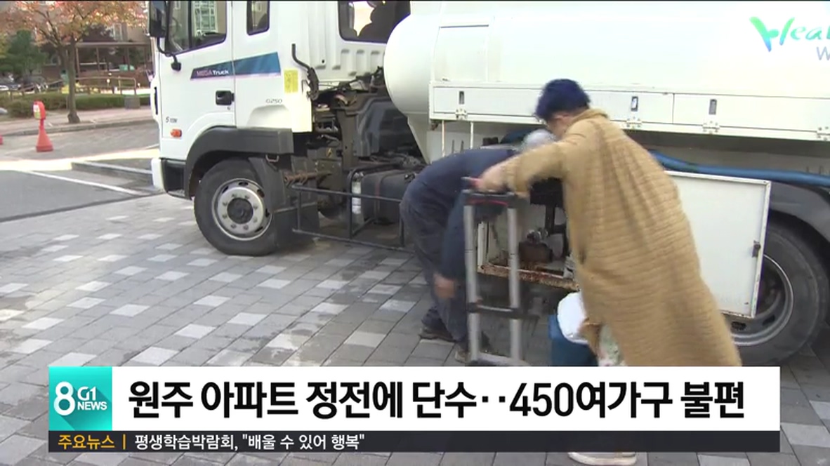 원주시 행구동의 한 아파트에서 정전과 단수 등으로 455가구 주민들이 17시간 넘게 불편을 겪었습니다.
