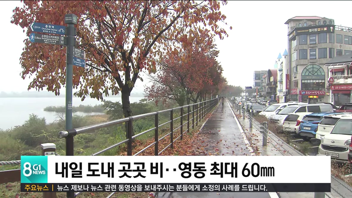 내일 강원도는 대체로 흐린 가운데, 영동지역은 아침부터 밤까지, 영서지역은 낮 한때 비가 오는 곳이 있겠습니다.