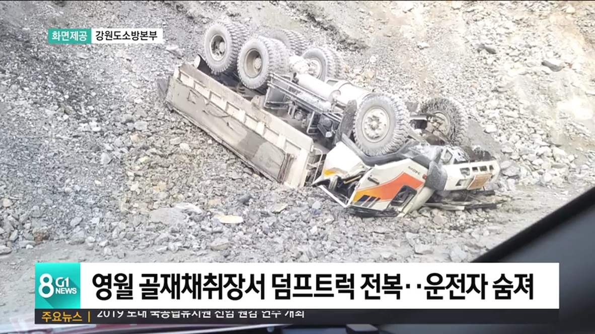 오늘 오전 8시쯤 영월군 남면의 한 골재채취장에서 70살 강모씨가 몰던 덤프트럭이 15m 아래로 미끄러진 뒤 전복됐습니다.
