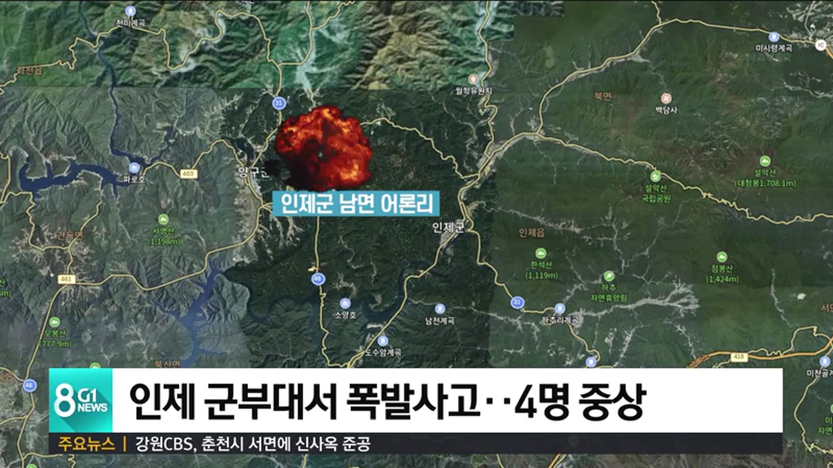 오늘(12일) 오후 3시 19분쯤 인제군 남면 어론리의 육군 모 부대에서 원인을 알 수 없는 폭발 사고가 발생했습니다.