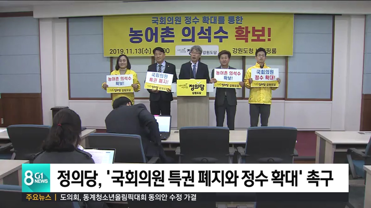 정의당 강원도당은 오늘(13일) 도청에서 기자회견을 열고, '국회의원 특권폐지와 의원정수 확대를 통한 강원도 및 농어촌지역 의석수 확보'를 촉구했습니다.