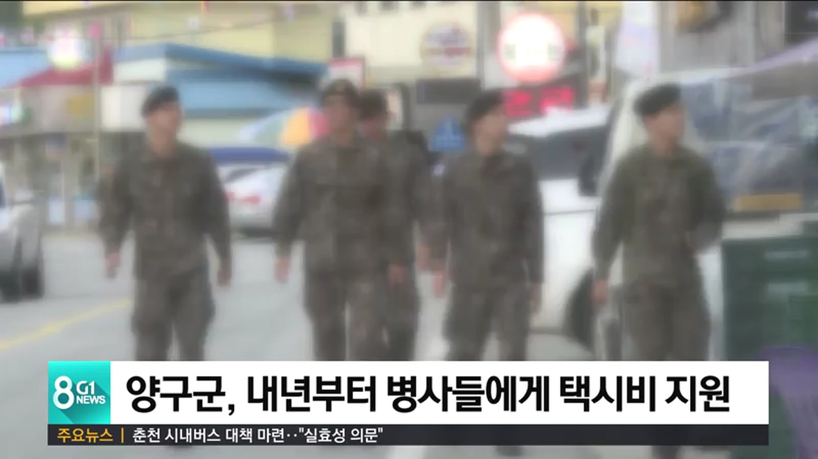 양구군은 민군 상생 방안으로, 내년 1월부터 평일 일과 후 외출을 하는 병사들에게 부대별 거리에 따라, 6천원에서 최대 1만 6천원의 택시비를 지원할 계획입니다.