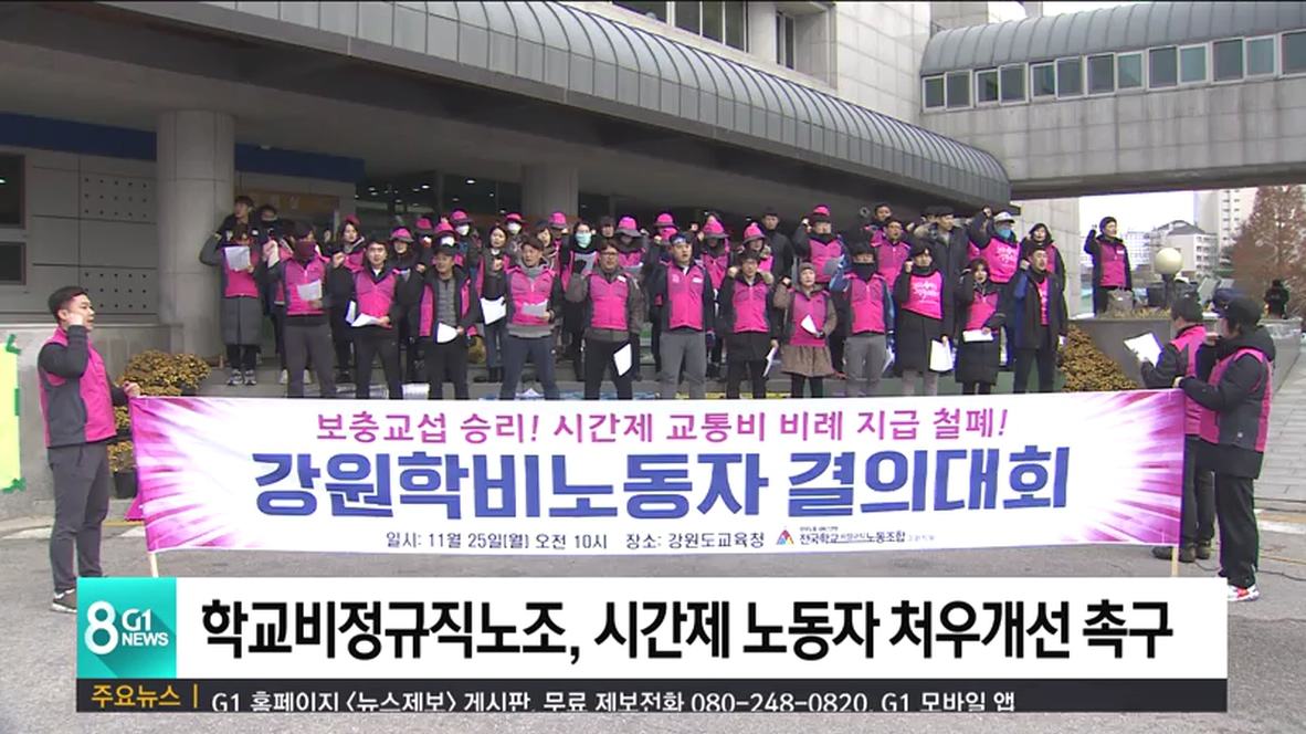 전국학교비정규직노동조합강원지부는 오늘(25일) 강원도교육청에서 결의대회를 열고, 비정규직 시간제 노동자들에 대한 처우 개선을 촉구했습니다.