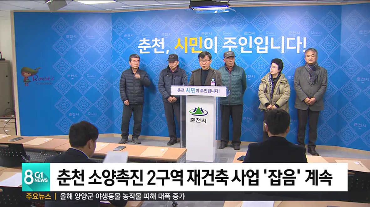 춘천 소양촉진2구역 재건축 정비사업 조합은 오늘(25) 시청에서 기자회견을 열고, "춘천시의 적법하지 않은 유권해석으로 사업이 지연되고 있고, 시가 중립성을 잃어 조합에 심각한 경제적 피해를 입혔다"고 주장했습니다.